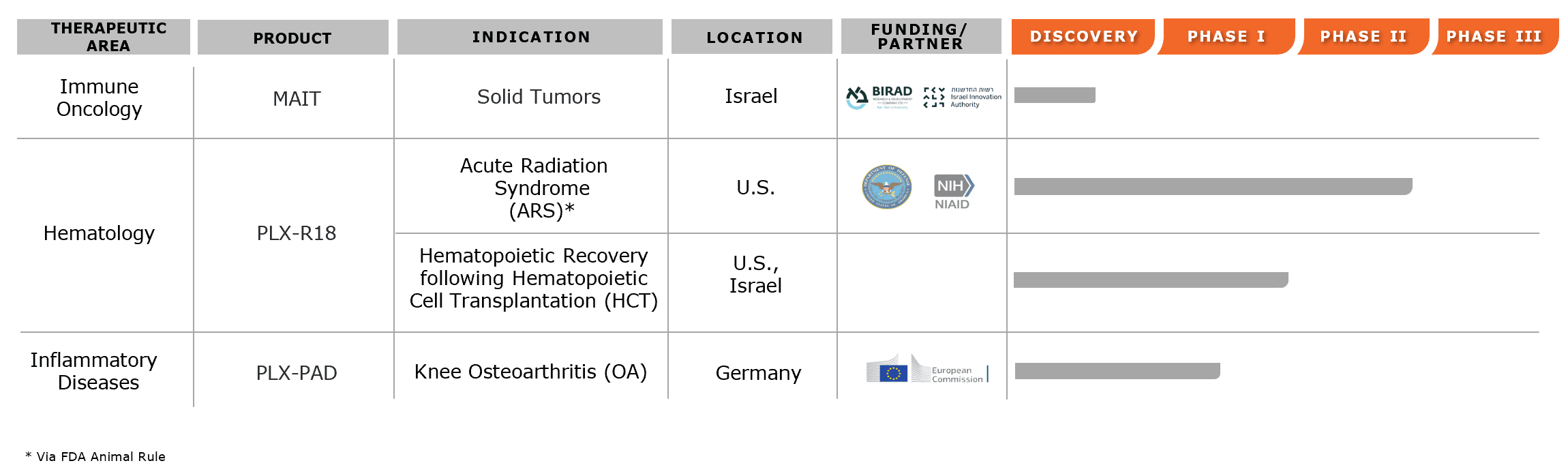 PLX-R18 cells release a combination of therapeutic proteins in response to a damaged or poorly functioning hematopoietic system, which plays a key role in protection from infection, uncontrolled bleeding and anemia. PLX-R18 is believed to stimulate the regeneration of damaged bone marrow to produce all blood cells lineages (white, red and platelets)